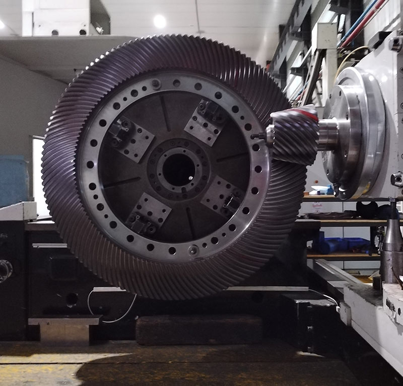 The gear diameter is 1450mm and adopts an involute gear profile. In order to reduce noise, the design incorporates increased tooth width and offset, as well as increased overlap. To address the issues brought by increased tooth width, such as machining and meshing, an LTCA analysis is conducted for the gear pair, with dynamic analysis using Romax, and techniques such as roll checking and modifying backlash are employed to ensure the reliability of gear engagement. The achievements of this project represent our company's in-depth research into bevel gear design and manufacturing technology. It has laid the foundation for the processing of large-sized involute bevel gears with large offsets, and accumulated design and manufacturing experience for the application of ultra-wide, low-noise bevel gears.
